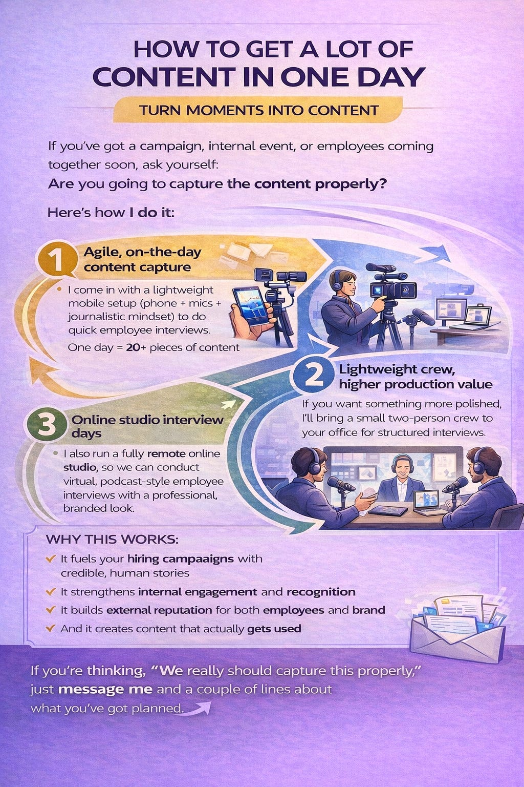 A single day can generate 20+ pieces of meaningful content - short-form video, employee insight clips, LinkedIn posts, written articles, and content that can support hiring campaigns for months afterwards.